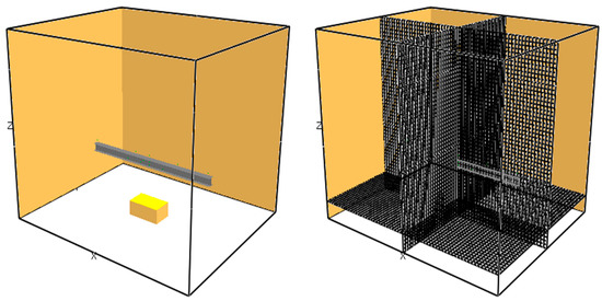 Extent of the Fire Dynamics Simulator model geometry (left) and the grid composition (right).