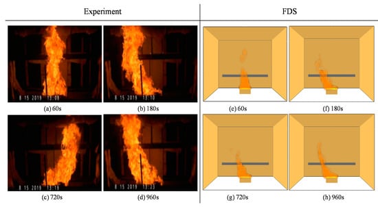 The movement of a flame greatly affects the temperature distribution. However, owing to the asymmetric installation of insulated walls around the experimental setup, the flame movement in the experiment was irregular under an uncontrolled wind flow [29]. Figure 11 shows the difference in the movement of the flame at 60, 180, 720 and 960 s between the experiment [29] and the FDS.