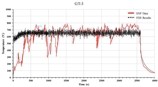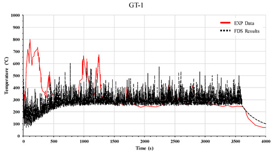 The gas cloud temperature was measured at three points, namely GT-1, GT-2, and GT-3, as shown in Figure 12. Figure 13, Figure 14 and Figure 15 show the gas cloud temperature of the experiments and the FDS. Compared with the experimental results, there were clear differences at all three points in the initial period (approximately 0–500 s). The difference would be caused by various factors in the experiment. This is presumed to be owing to the unexpected movement of the flame, the irregularly condensed fuel, and the ignition delay in the uncontrolled experimental conditions. However, after the initial period, the gas cloud temperatures in the experiment and FDS showed good agreement at the three points.