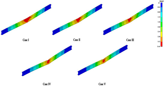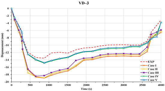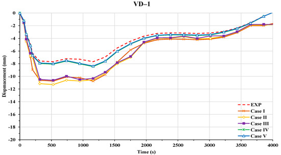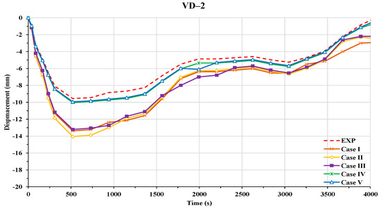 Five cases were considered to determine the appropriate top use in two-way FSI to determine the non-linear structural response of an H-beam to a propane burner fire. The representative values used to determine the effect of the difference in , namely vertical displacements, were measured at three points, namely VD-1, VD-2, and VD-3, as shown in Figure 19.