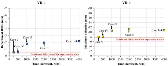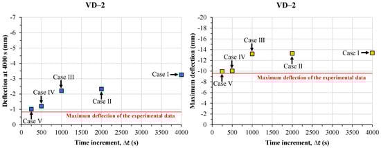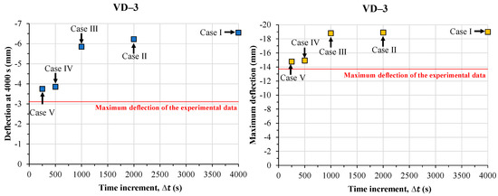 Deflection at 4000 s and maximum deflection versus time increments () at VD-3.