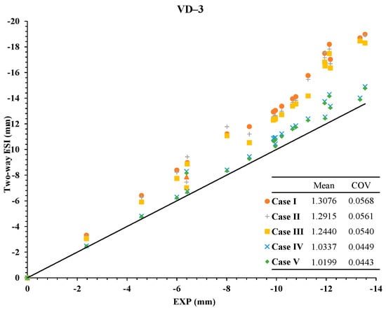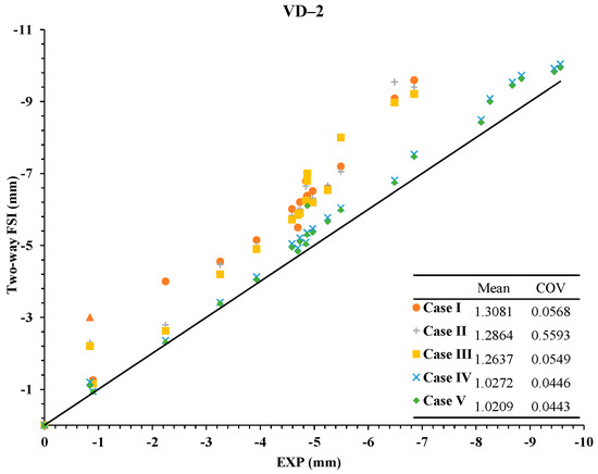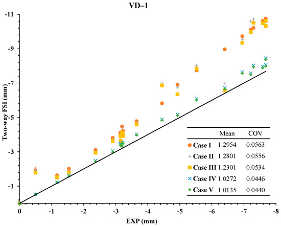Figure 26, Figure 27 and Figure 28 analyze the reliability of two-FSI for deflection versus time increments () comparing to experimental data. In Figure 26, Figure 27 and Figure 28, the mean of Case IV and Case V are 1.0272 and 1.0135 at VD-1; 1.0272 and 1.0209 at VD-2; 1.0337 and 1.0199 at VD-3 respectively. Thus, Cases IV and V have good agreement in all of the vertical displacement periods. Additionally, Case IV and Case V have lower COV than other cases as shown in tables in Figure 26, Figure 27 and Figure 28.