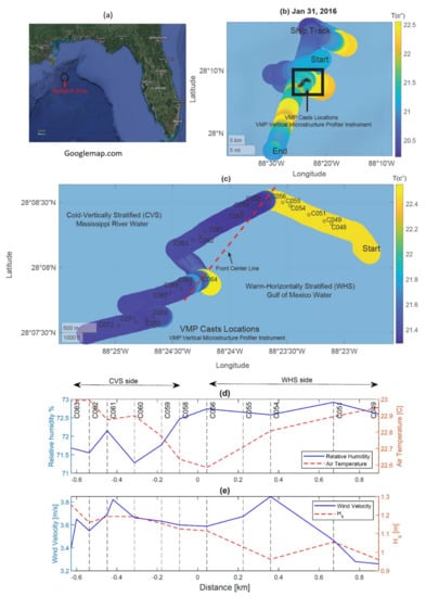 (a) The location of data collection in the northern part of the Gulf of Mexico (GOM). (b) The surface temperature colors the ship track. (c) The subdomain of the ship track where the VMP200 collected the vertical profiles of ocean properties is shown. The dashed red line shows the relative locations of the front center. (d) The relative humidity, (d) the air temperature, (e) the wind velocity, and (e) significant wave height, H, are presented across the front. The vertical dashed-lines in graphs (d,e) give the horizontal distance of the VMP200 deployments for upcasts C049 to C063 from the front center shown by zero distance.