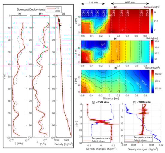 To compare the relative contribution of the S and T to density across the front, we plotted their relative contribution to density (McDougall et al. [30] method) using two selected VMP200 profiles, each from either the CVS or WHS side of the front (Figure 2g,h). The CVS side was characterized by large and compensated T and S contribution to density when compared to the WHS side. On the WHS side, the S contribution to density was weaker with the temperature dominating the density variability. Each T and S vertical contribution to density had its contribution sign changed at around 15 m depth (Figure 2g,h).