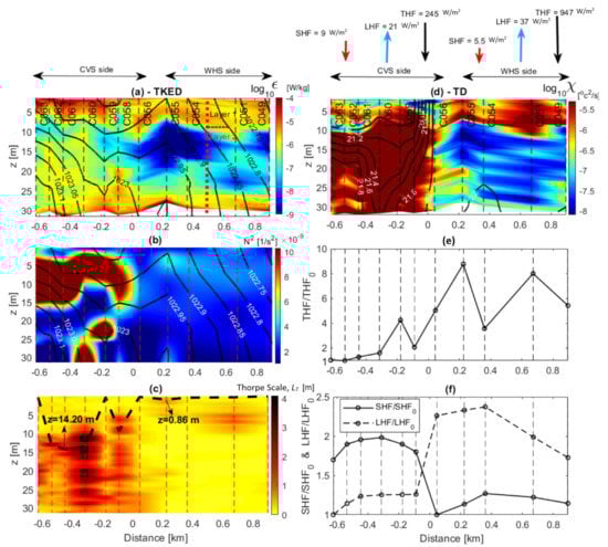 The averaged value of the surface heat fluxes and its direction for both side of the front combined with the TD cross-front map is presented in Figure 3d. The TD graph presented two layers on each side of the front (Figure 3d), which is the same as the TKED graph (Figure 3a). The first layer started from the water surface to a depth m, and the second layer was created below a depth m. Large TD values characterized the CVS side but lower surface THF values when compared to the WHS side.