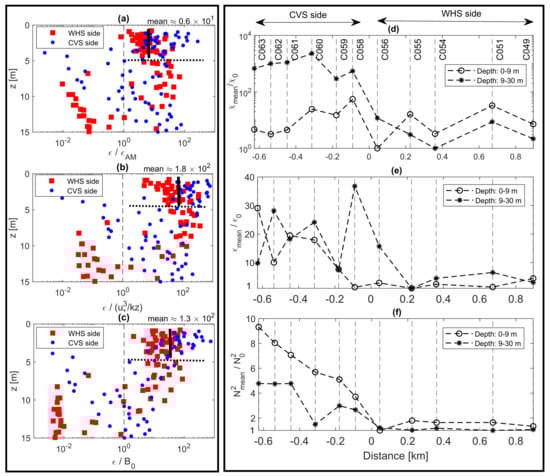 The CVS side presented 10 to 30 times larger TKED than the WHS side and irrespective of the layer depth (Figure 4e). The normalized (Figure 4f) was larger on the CVS side by a factor of 5–10 when compared to the WHS side. The near-surface (averaged within 0–9-m depth) was the largest on the CVS side, as it likely reflects the effects of the near-surface stratification on that side.