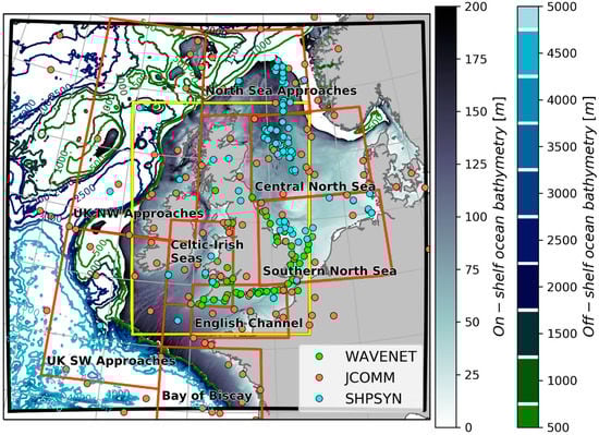 North-west (NW) shelf physical context and model domain. The NW shelf domain (black boundary) includes atmosphere, ocean and wave components; the inner region (1.5 × 1.5 km) of the Met Office Unified Model (UM) atmosphere model domain is also presented (yellow boundary). In-situ observations are shown as solid dots and areas for analysis across the model domain are indicated in red. In-situ observations comprise the Joint WMO IOC Commission for Oceanography and Marine Meteorology’s operational Wave Forecast Verification Scheme (JCOMM), Ship Synop Observations at fixed platforms (SHPSYN) and UK WAVENET and Chanel Coastal Observatory (CCO) in-situ observations for coastal waters (WAVENET).