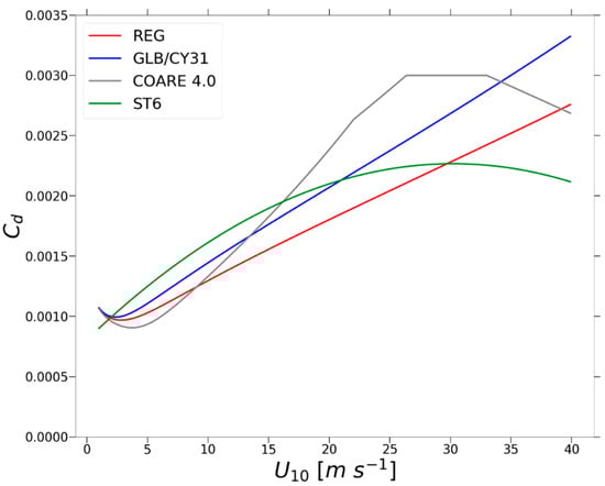 is passed to WWIII where the wind friction velocity is computed as . Several model parameterisations use constant (e.g., WWIII regional and global model configurations; Figure 2-REG and -GLB/CY31). However, in the modified COARE 4.0 boundary layer scheme (Figure 2-COARE 4.0) increases with wind speed up to an upper bound (22 ms−1), after it is constant and decreases linearly for winds above 33 ms−1 for the particular case of the UM. The cap and reduction of the drag coefficient are modifications introduced recently into global and regional operational systems at the Met Office in order to reduce excessive drag at high winds in tropical storm areas. These modifications incorporate a cap of 0.003 following Donelan [31] and a reduction to a lower value at very high wind speeds following Hsu et al. [83].
