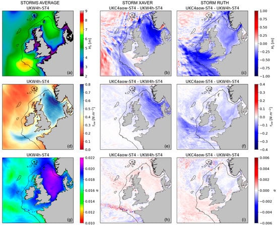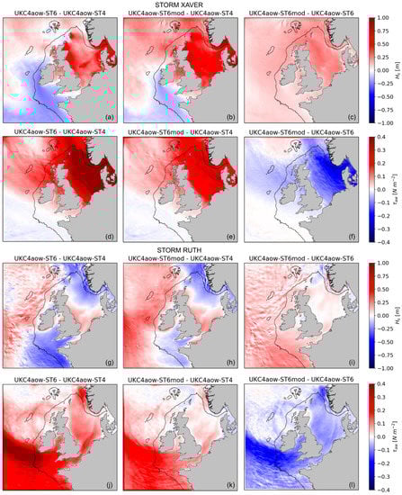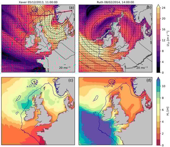 Two extreme events affecting both the shallower shelf seas around the UK and the western approaches (off-shelf) are highlighted: the extratropical cyclone Xaver on 5–6 December 2013 and storm Ruth on 8–9 February The former generated a major storm surge affecting the North Sea and the coasts of Scotland and northern England [86,87]. Xaver formed to the south of Greenland on 4 December, and quickly developed as it moved east over Scotland towards the North Sea, intensifying further and reaching its lowest pressure over the Baltic Sea (967 hPa). Gusts exceeded 60 knots across the North and Irish Sea coasts and maximum significant wave heights exceeded 8 m. Windstorm Ruth affected the western approaches and the Irish and Celtic Seas with winds gusting at 60–70 knots and offshore waves across the SW approach reaching 12 m. The southern storm track (lowest pressure of 945 hPa) allowed storm waves to propagate into the Irish and Celtic Seas, causing very energetic wave conditions along the coast of Wales and SW England. Storm Xaver affected mainly fetch limited areas whereas the strong winds during storm Ruth mainly intensified in the western approaches after crossing the Atlantic.
