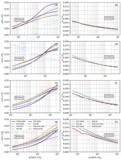 (a,c,e,g) Dimensionless wave growth and (b,d,f,h) inverse wave age as a function of dimensionless fetch for constant winds from 10 to 30 ms−1 for different model configurations. Fetch limited growth and inverse wave age evolution curves include deep water and 80 m depth relationships for ST4 (ST4-1000 and ST4-80), ST6 (ST6-1000 and ST6-80) and ST6 with a modification on the drag coefficient as per Edson et al. [23] (ST6mod-1000 and ST6mod-80). The theoretical curve of Young and Verhagen [88] is presented in the fetch limited growth representation (YV96-1000 and YV96-80). Results for the different configurations correspond to 48 h model runs using a 5 km resolution grid.