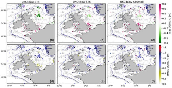 Averaged significant wave height bias (a–c) and RMSD (d–f) for the quantile of 90% (Q90%) at in-situ locations for the coupled experiments (UKC4aow-ST4, UKC4ow-ST6 and UKC4aow-ST6mod). The 200-m isobath (solid blue contour) is included to indicate the continental shelf limit.