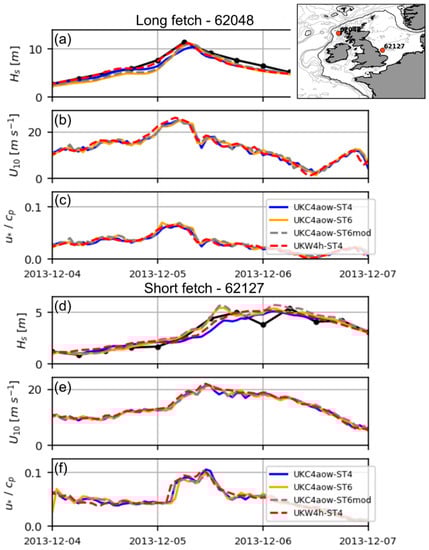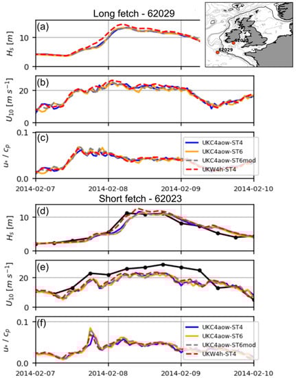This formulation shows a good performance for faster wave growth for young seas [30] and therefore has the potential to improve model prediction of rapidly developing waves during storm conditions common to the fetch-limited shelf seas of the NW shelf. However, this parameterisation might result in overestimation at lower wind speeds relative to Ardhuin et al. [38] when coupling with the atmospheric model, as Equation (18) is not preferred when comparing against the atmosphere-ocean bulk flux parameterisation implemented in the UM model (COARE 4.0 with cap and reduction of the drag at higher wind speeds; [23]).