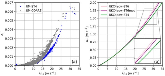 where near-surface wind speed is expressed relative to the ocean surface current speed, , such that . Then, z0 is computed following Charnock relation [80] as per Equation (22) with based on the COARE algorithm [23] and the wind speed dependent drag coefficient calculated as