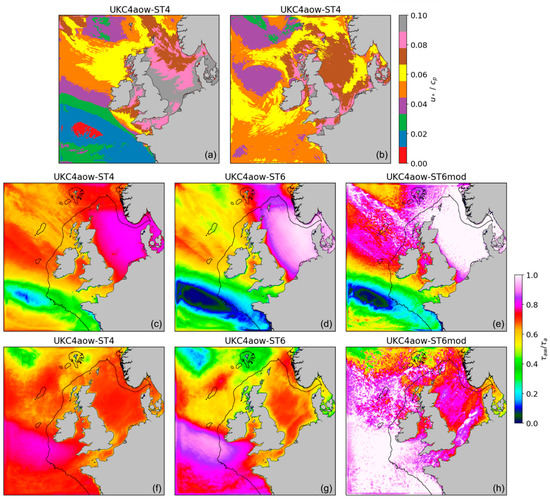 Coupled experiments (Table 2, coupled) focus on the atmosphere-ocean-wave UKC4 coupled system with some additional modifications to the model configuration. These modifications are focused on: (i) WWIII source terms parameterisations (UKC4aow-ST4 and UKC4aow-ST6), and (ii) coupling exchanges (UKC4aow-ST6mod). UKC4aow-ST4 corresponds to the actual configuration of the regional coupled research system (refer to [84]). This configuration uses ST4 wave physics with the flux computation included in the source terms and presents the surface roughness closure coupling strategy: two-way feedback between the atmosphere and the wave model, where winds from the atmospheric model are passed to the wave model which returns the Charnock coefficient. The UKC4aow-ST6 experiment uses ST6 wave parameterisation and the same surface roughness closure coupling strategy as UKC4aow-ST4. The source term ST6 is limited using the flux parameterisation proposed by Hwang [78]. UKC4aow-ST6mod differs from UKC4aow-ST6 in the coupling strategy (i.e., exchanged variables). The former follows the surface stress closure strategy where there is no two-way feedback between the atmosphere—wave components but one-way transfer from the UM to WWIII to pass the stress () and the density () independently of the sea state. All fields are exchanged using OASIS3-MCT at a coupling frequency of one hour. Lateral boundary conditions for atmosphere and wave components are consistent across all three experiments and are provided from the relevant Met Office operational global model archive.