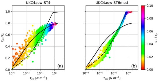 The main feature of the stress closure for ST6 coupling strategy is the modification of the coupling from the UM to WWIII to pass the atmospheric stress () and the density (). The stress is calculated in the atmospheric model independently of the sea state accounting for atmospheric stability and following a wind dependent formulation () that is consistent with a modified version of the COARE 4.0 algorithm [23]