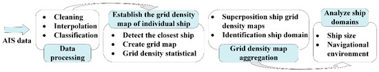 The ship domain is defined as an area that the navigator should maintain safe distance between other vessels [7]. In this study, all navigational trajectories of the ship object in the research area are utilized to dynamic statistic the grid density of the nearest other ships, and then establish ship domain. The necessary foundation data of ship domain model can be obtained from the AIS data, including the speed of ships, the heading of ships, and the position of ships. The statistical analysis method of ship domain includes four parts, which are shown in Figure 1.