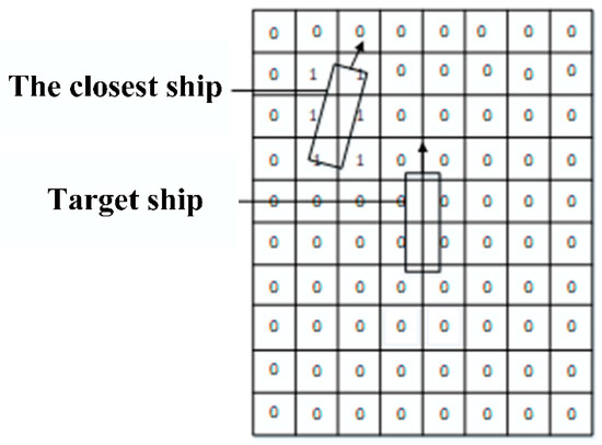 - Establish the grid density map of individual ship. The research area is divided into the same size grids; the initial value of each grid is 0. It is necessary to dynamically search for the closest ship between and the target ship at 1 s interval time. At one time, the value of each located grids of the closest ship is denoted as 1. Accumulating the values of the same grid number at each moment, the grid density map of individual ship can be established. As the heading and position of the target ship changes with time, the relative orientation of other ships should be dynamic.
