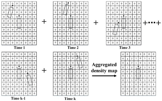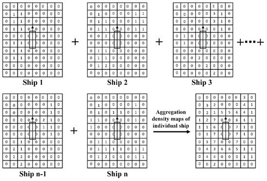 - Grid density map aggregation. In order to analyze the regional characteristics of ship domain of different types of ship, each grid density map of all individual ships of the same type were integrated.