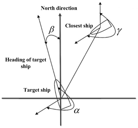 The grid density of the target ship during the whole voyage can be calculated according to the accumulated values of the same grid number at each moment, as shown in Figure 3. The position and the heading of the target ship is constantly changing. The relative direction between the target ship and the nearest ship changes over time. In order to ensure the heading directions of the target ship are parallel to the y-axis of the grid diagram, it is necessary to convert the angle between the target ship and the nearest ship at each moment [39]. The angle conversion diagram is shown in Figure 4. In Figure 4, is the angle between the heading of the nearest ship and heading of the target ship, is the angle between the heading of the target ship and the north direction, and is the angle between the heading of the nearest ship and the north direction.