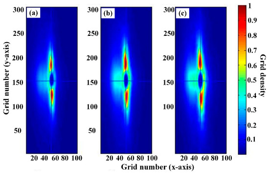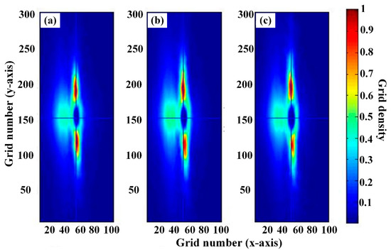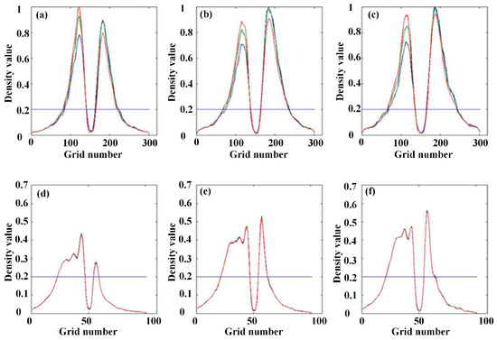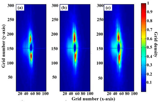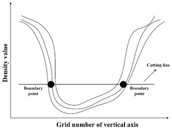 Ships are divided into three categories based on the ship length, 60–79 m, 80–99 m, 100–120 m. The grid density maps of the same type of the individual ship are aggregated to calculate the ship domain of the same length range, and the aggregation processes is shown in Figure 5. The density value is normalized between 0 and 1, and the grid is recovered with different color according to the density value. Then, the grid density map can be obtained, which can clearly show the shape for various types of ship domain. The size of the ship domain can be calculated by segmenting the grid density map [31,40], as shown in Figure 6. The number of grids between the intersect points formatted by the cutting line and the density curve denotes the length of the ship domain.