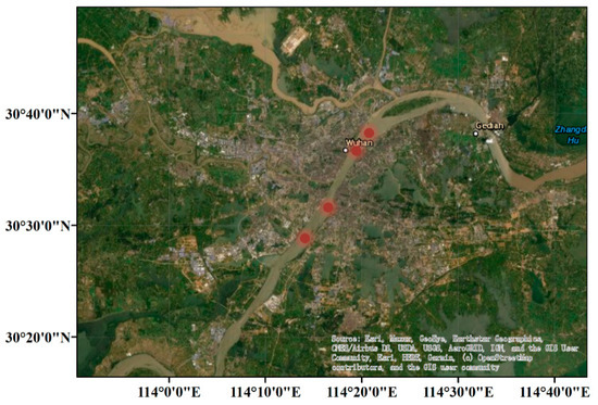 The Yangtze River is the “golden canal” of China. In this section, the proposed spatiotemporal statistical analysis method is used to establish and analyze the ship domains in a typical inland water, the Wuhan section of the Yangtze River. Figure 7 shows the study area from 30.533 to 30.706° N and from 114.296 to 114.508° E. The length of the study water is about 30 km, and the width is between 1 and 2 km. When sailing a ship through the bridge areas, the maneuvering behavior of a sailing ship should be changed based on the ship traffic separation regulations. The bridge is regarded as an important environment factor of ship domain in the experiments. The red areas of Figure 7 are the bridge areas, including the Wuhan Baisha Chau Bridge, Wuhan Yangtze River Bridge, the Second Wuhan Yangtze River Bridge, and the Erqi Yangtze River Bridge.