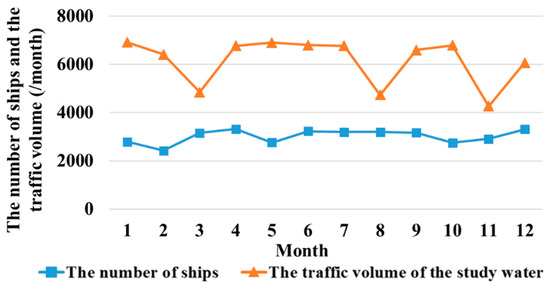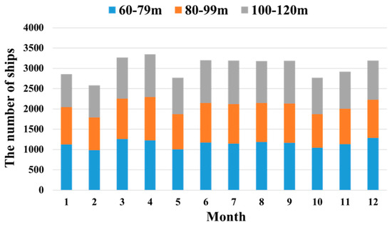 The Changjiang Maritime Safety Administration provided the AIS data and the static data of ships in the study area. There were 200 million records of AIS data of the study water in 2014. According to statistical analysis of the length of ships in each month of 2014, most of the ship lengths were in the range of 60–120 m, as shown in Figure 8. The ships were divided into three groups based on the ship length: 60–79, 80–99, and 100–120 m, respectively. The number of ships sailing on the study water and the traffic volume of the study water in each month were counted, and the statistical results were presented in Figure 9. We can see that the numbers of ships in February, March, and October were obviously less than the numbers of ships in other months in 2014.