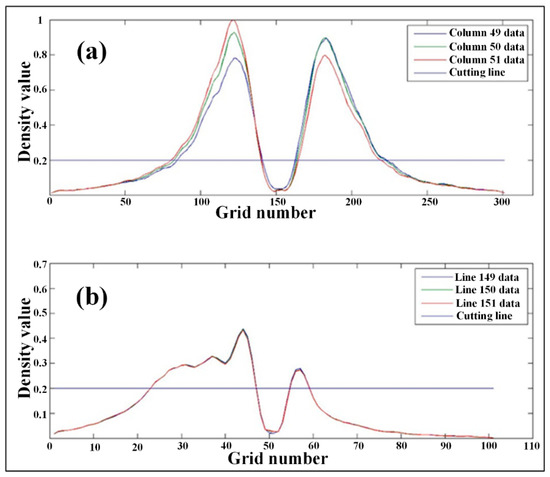 In Section 4.2.1, the grid density maps of three types of ship are calculated, and the ship domains can be established. From the density maps, we can see that the critical density causing the change between the mesh color of the ship domain and the nonship domain is about 0.2. Therefore, the cross-section image is segmented with a threshold value of 20% of the maximum density value [39] According to measure the distance between two points which are the intersection points of the cross line and the grid, the length of ship domain and the width of ship domain can be calculated, and then the relationships between the ship size and the domain size can be analyzed. The grid density data in January is taken as an example to product the cross-section image, which is shown in Figure 14. Figure 14a indicates three columns of grid density data in the direction of longitudinal axis of the ship center, and Figure 14b indicates three rows of grid density data in the direction of horizontal axis of the ship center. The blue straight lines are the cutting lines in Figure 14a,b.