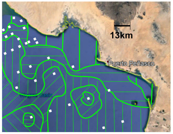 Coastal headlands are also potential in-stream tidal energy sites because of the local flow accelerations caused by the headland [8]. Therefore, one may envisage assessing the tidal energy resources around headlands within the GC. One such headland is Punta Choya, shown in Figure 1. However, there are no islands in front of it that constrain the flow, as in the Infiernillo Channel, the two headlands delimiting the entrance to Adaír Bay constrict the flow within the Bay. Near Punta Choya, the tidal range is more than six meters, and flow speeds between slack waters could be sufficiently large for in-stream tidal array developments. The energy demand of the region depends on commercial activities and the electricity and illumination needs of nearby towns, and therefore the power transmission lines are well developed [9]. While new renewable energy developments would require an increase in transmission line capacity, having the transmission line infrastructure nearby is advantageous.