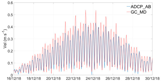 Tidal Signals for ADCP measurements and GC_MD model outputs at AB. The time series period covers a neap–spring–neap cycle at the observation point, with the high frequency oscillations corresponding to the semi–diurnal dominant tide, the M2 principal component.