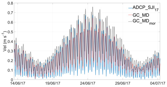 To validate the morphodynamic model GC_MDmor, we used the depth-averaged reconstructed tidal ADCP measurements taken at the SJI117 mooring, and the corresponding depth-averaged, reconstructed tidal signal predicted by GC_MDmor. We found a good correlation of 0.88 (see Table 2) and an excellent relative error of 9% between model and measured data, but in Figure 5 we see that the GC_MDmor model overestimates the flow speeds at the ADCP moorings. Table 2 shows the value of the , which is quite high, considering the mean values of the velocity field at this location, also shown in Table 2.