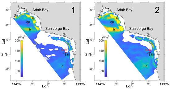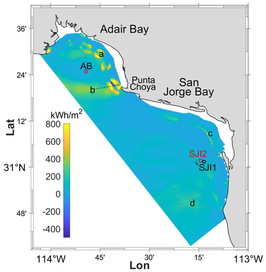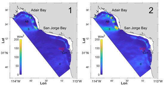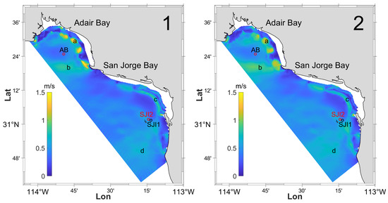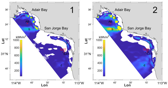 Figure 6 shows the yearly mean of the spring tidal maxima flows, , for the GC_MD (Subplot 1) and the GC_MDmor models (Subplot 2). The largest values in San Jorge Bay were also on or near regions with bottom sand ridges, but the effect of the bottom bathymetry is more noticeable in Adaír Bay. The largest values of were observed as well in the nearshore of Adaír Bay, where we have a series of shoals, with the site just North of Punta Choya (see Figure 1) being the most important region for tidal energy resources.