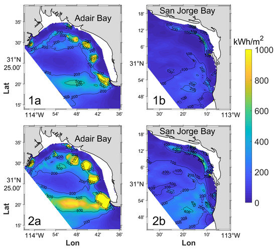 Figure 8 shows the AEP maps, with contours of 500 kWh m−2 delimiting high-energy regions in Adaír bay; these contours can be seen in the results for both the GC_MD (subplot 1a) and the GC_MDmor models (subplot 2a). When using the GC_MDmor model (subplot 2a), i.e., when the seabed evolves in time, these high-energy regions cover a much larger area. In particular, the region with maxima AEP located at the southeastern boundary of Adaír Bay extends further to the west in the model GC_MDmor, in comparison to GC_MD. In the plots 1b and 2b of Figure 8, we also observe this spreading of what we may call good sites for tidal energy exploitation, as measured by the spread of the 200 kWh m−2 contour, extending in San Jorge Bay in GC_MDmor, and an increase from 200 to 400 kWh m−2 in the locations of large AEP. However, in San Jorge Bay these regions are significantly smaller than in Adaír Bay, for both the GC_MD (plot 1a vs plot 1b in Figure 8) and the GC_MDmor models (plot 2a vs. plot 2b in Figure 8). We can identify the sites with the best renewable energy resources from the AEP maps. Most importantly, however, is the fact that the plots in Figure 8 show the impact of natural seabed evolution on areas with exploitable renewable energy resources. Indeed, within a year the size of such regions has more than doubled in Adaír Bay, a reassuring result for any would-be tidal energy developer interested in implementing a tidal energy demonstration plant in the region.