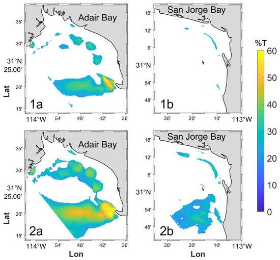 Percentage time, , when TPD is above 50 W , for Adaír Bay (subplots 1a and 2a) and San Jorge Bay (plots 1b and 2b) obtained with the GC_MD (subplots 1a and 1b) and with the GC_MDmor models (subplots 2a and 2b).