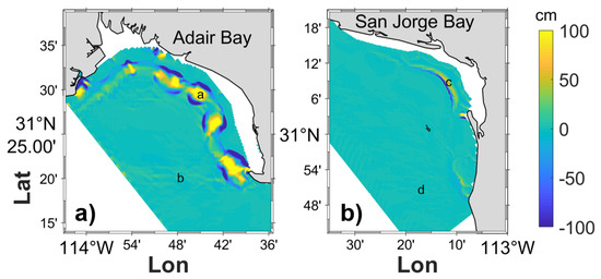Depth change pattern maps after one year of simulation (GC_MDmor model). Yellow areas: Seabed erosion regions, with a depth change of 100 cm or larger. Blue areas: Seabed accretion regions, with a depth change of −100 cm or larger. These blue and yellow areas are (a) near the coast of Adaír Bay, mostly on the eastern side of the Bay, and; (b) near the coast of San Jorge Bay, mostly on northeastern and eastern sides of the Bay.