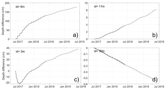 Bathymetric evolution trends in GC_MDmor after two years of simulation, with the first year in a darker shade, at the locations (a–d) marked in the maps of Figure 12 and Figure 13. The id number on the northwestern side of the subplots is the initial depth at the location being considered. The high-frequency oscillations are driven by the neap-spring tidal cycle. The tendency of change in the second year is similar to that in the first year at all four locations, so only the first year is discussed in detail.