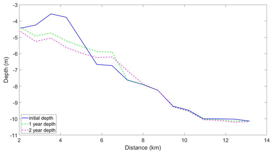 Figure 15 shows depth changes as a function of distance to shore after one year and after two years of simulation. The region between 2 and 5 km from the shoreline is an erosion zone, while the region between 5 and 8 km from the shoreline is an accretion zone. We also observe a small accretion zone between 11 and 13 km from the shoreline. The figure shows there is a net seawards migration of sediment over time. The profile is likely to be converging towards an equilibrium profile under the action of the tidal forcing. The equilibrium profile has a slope that is much smaller than that for the equilibrium beach profiles defined by Dean [28] for wave-driven sandy beaches, in line with macrotidal environments such as this one [29]. However, the tendency towards an equilibrium is not observed at other locations further offshore, as Figure 14 demonstrates.