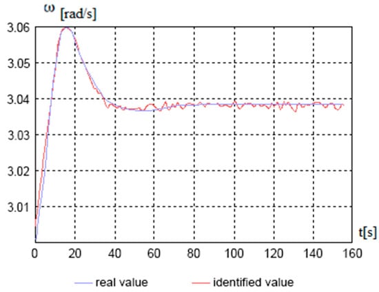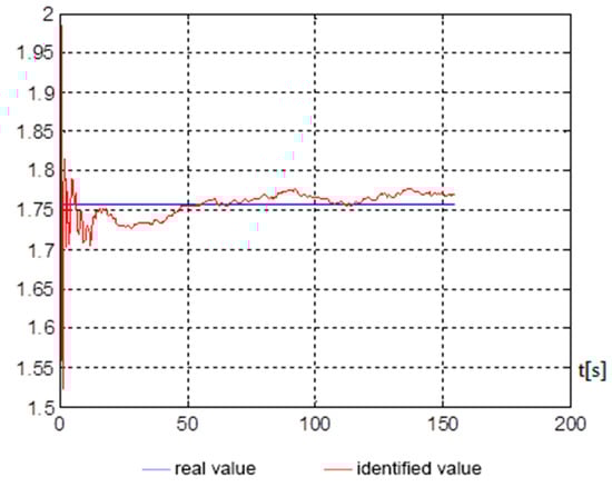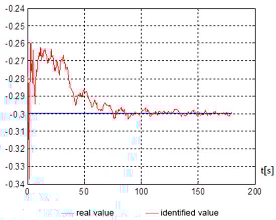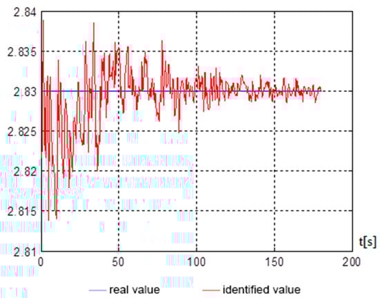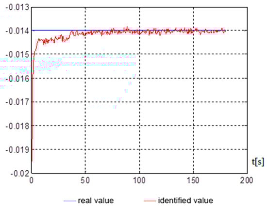 Figure 5, Figure 6, Figure 7 and Figure 8 show, on average, at 150 s, that good indicators are obtained for evaluating the parameters, namely: , , , . The end of the identification transition process occurs at 50 s. For a vessel that is an inertial object, the resulting identification speed is more than satisfactory and can be used in automated control systems of a marine vessel.
