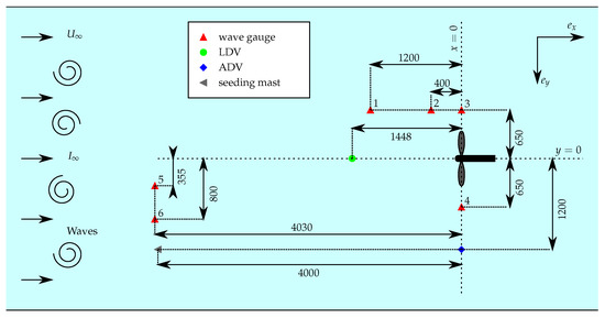 A number of wave probes are also placed next to the turbine to verify the wave parameters set for each of the case scenarios. Three resistive wave probes are used at the facilities in Ifremer and FloWave [15]: probes 1–3 as seen in Figure 3. A mix of resistive, ultrasound and dynamic wave probes is used in the Cnr-Inm tow tank: probes 3–6 as seen in Figure 3, where probes 4 and 6 are ultrasound wave gauges and probe 5 is a dynamic wave gauge. One single identical resistive wave probe is used in all facilities (probe 3). This is a crucial aspect of the test campaign, especially since the flow characteristics impacted by the addition of waves are deemed to be relevant between facilities.