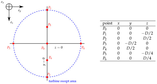 Front view of the ADV measurement points describing the swept area of the turbine and their coordinates expressed in diameter . Points 0 to 2 and 5 and 6 are acquired at Ifremer. Points 0 to 2 are acquired at Cnr-Inm. Points 0 to 4 are acquired at FloWave.