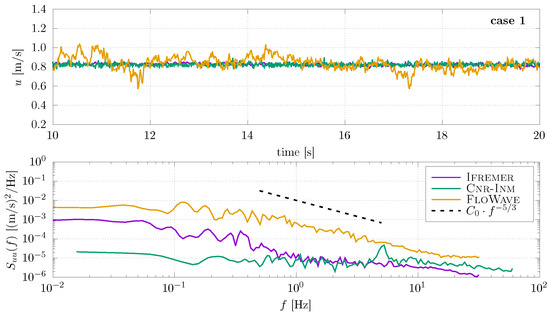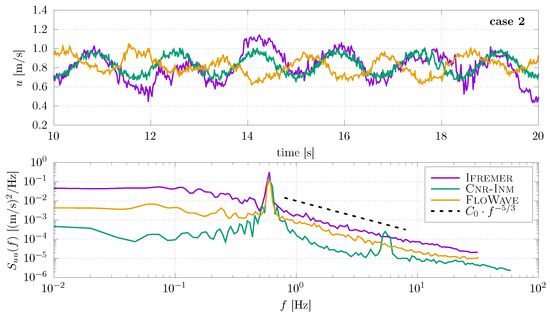 In Figure 6, time history at Ifremer shows slightly higher velocity ranges than the other two facilities. In the frequency domain, flow velocity shows higher energy levels. These are associated with the flow disruptions and turbulence created by the position of the wavemaker located upstream of the test area. The −5/3 power law is clearly present at Ifremer and FloWave. However, the spectra measured at FloWave contains lower energy. The lowest one is spectra measured at the Cnr-Inm facility. Similar to case 1, the energy spectra at Cnr-Inm still presents the ADV probe vibrations at Hz. These vibrations are actually thought to be associated with a combination of carriage speed, wave conditions, and the ADV being mounted below the carriage (see Section 2.2.2). In all facilities, a periodic component with the same energy level is clearly visible on the PSD, indicating the wave orbital velocities for case 2, with a wave frequency of 0.6 Hz.