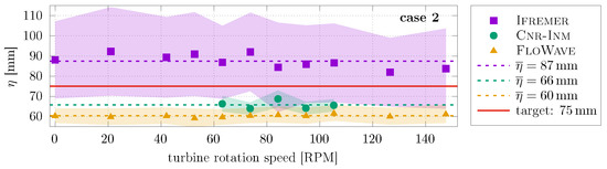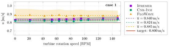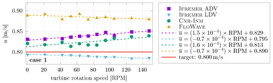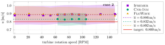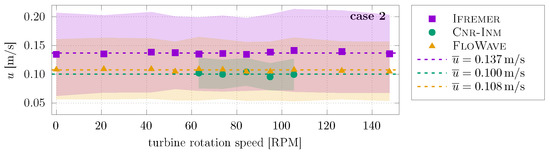 ADV measurements are also obtained throughout the test campaign with the ADV placed at 1.2 m from the turbine axis (see schematic on Figure 3) when operating and in synchronisation. Figure 7 and Figure 8 show the variation of the average and standard deviation velocity for cases 1 and 2, respectively, with the turbine rotational speed. Table 6 shows the time and case average of the streamwise velocity u for all cases at all facilities. Overall, average flow velocity at all facilities is higher than the nominal velocities, i.e., similar behaviour seen in the bare-basin measurements in Table 5. For the current-only case (case 1), FloWave presents flow velocities 10% higher than the nominal velocity. With the addition of regular waves (case 2), FloWave and Ifremer have flow velocities 10% higher than the target velocity. In contrast, flow velocity at Cnr-Inm is closer to the target value. Results obtained with the DIVA method (Table 5) present higher values than the ADV at FloWave and Ifremer and lower values at Cnr-Inm. These differences are mainly attributed to blockage effects and rotor-induced velocities.