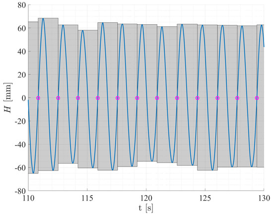 Four regular waves in-line with the current are chosen with wave frequencies between and 0.7 Hz and wave amplitudes between 35 and 75 mm. The wave amplitude and frequency are selected based on information provided by the facilities where some can achieve better wave properties at certain frequencies than others, especially when combined with current. One irregular wave setting is included in the test plan with a maximum wave frequency of and a significant wave height of . At full scale, these wave parameters are associated with wave amplitudes between and 1.5 m and wave frequencies between and 0.18 Hz (periods between and 7.8 s). According to [32], ordinary gravity waves with periods around 7 s have the largest relative height and are the ones a tidal turbine will be subjected to more frequently. Although the waves tested might be considered small compared to real sea states, the aim of the RRT is to repeat the same conditions in different facilities and to assess the impact on the turbine. Therefore, the selected wave conditions are theoretically replicable at all the facilities and, as it will be seen in Section 3.3, a periodic velocity component is generated. The summary of the tested flow conditions is presented in Table 4.