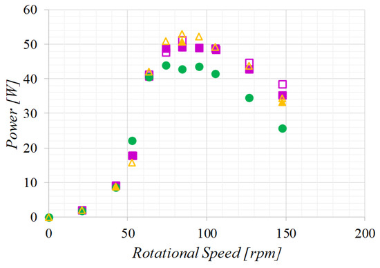 For each of the test cases, eleven rotational speed settings are considered. These range from 0 to for flow velocities of 0.8 m/s and from 0 to for flow velocities of 1.0 m/s. Maximum values are close to free-wheeling operation. To quantify the uncertainty of the experiment, repeated tests are considered for each case for several rotational speeds. Due to time limitations and the long wait between tests at Cnr-Inm, the test matrix is constricted to five rotational speeds per case plus two rotational speeds for the repeated tests. Note that the repeated tests are performed at the end of the test programme to allow for a randomised data acquisition while ensuring a time-efficient test campaign.