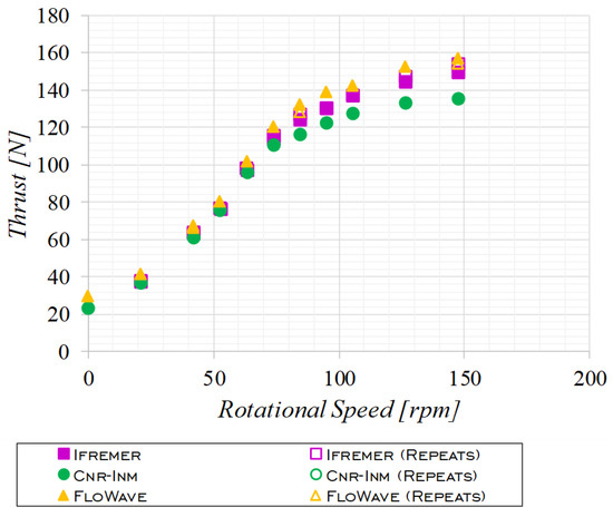 Thrust values at FloWave and Ifremer are higher than at Cnr-Inm by up to 15% for all rotational speed setting available.