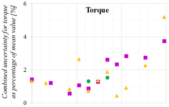 The combined expanded uncertainty is thus calculated based on Equation (2), using a coverage factor which gives a level of confidence of nearly 95% as reported by [34]. The combined uncertainty is presented as a percentage of mean value for better interpretation. This analysis is based on the recommendations made by [16,35]. Further calculations are required when looking at error propagation of other parameters; for example, when power and thrust coefficients are calculated, as it is described in [35].