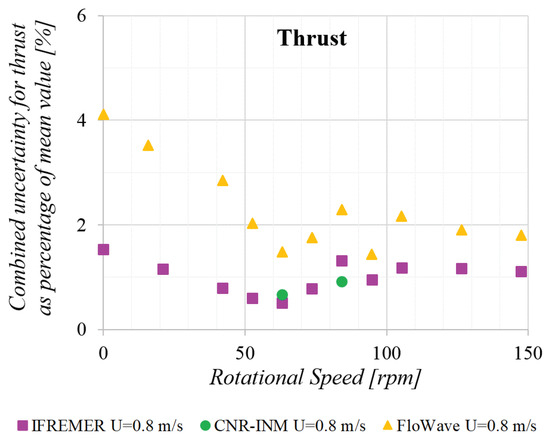 When looking at the analysis in terms of turbine operating points; i.e., rotational speed in this work (Figure 16), the Ifremer torque data suggest that, as the turbine approaches the free-wheeling condition, the uncertainty slightly increases. The same can be said for the thrust values except for the first two points at high load conditions. A similar trend may be depicted from the two Cnr-Inm cases, but, due to the limited number of tests, this hypothesis can not be confirmed, especially since the FloWave data do not show a clear pattern. This behaviour may be related to larger vibration from the turbine when this increases its rotational speed.