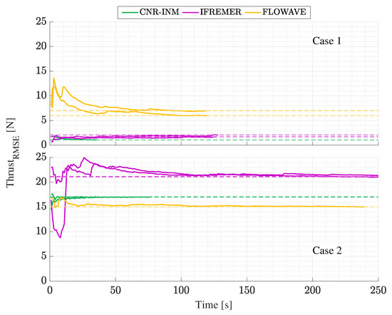 At FloWave, the thrust RMSE stabilises between 6 and , whereas, at Ifremer, the thrust settles at values around except for the first few seconds of one case. At FloWave, it takes the torque and thrust up to 50 s to stabilise, whereas this is obtained at around 20 s in Ifremer. From the present observations and previous observations done by [15], the turbulence intensity, the shear flow and the vertical flow component are higher at FloWave than at Ifremer for case 1; thus, in the future, it would be advisable to acquire longer samples to allow the turbine to stabilise better in faster flow conditions.