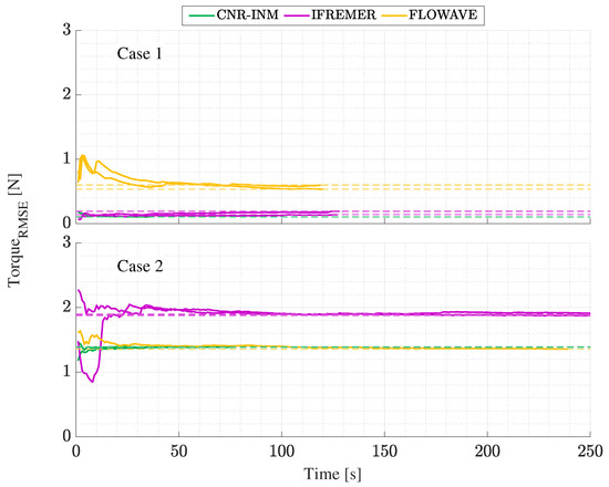 In an attempt to understand the high uncertainty values seen at FloWave (Table 10 and Table 11), Figure 17 and Figure 18 look at how the turbine loading stabilises with time when operating at for cases 1 and 2 for thrust and torque, respectively. Images show repeat runs when available. These are calculated using the root-mean-square error (RMSE) over the time series (see Section 2.7).