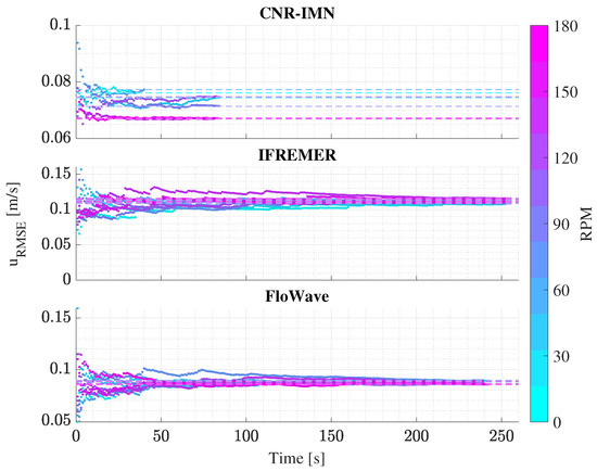 To understand the loading stabilisation, Figure 19 looks at the convergence of the flow velocity u for case 1 at all facilities using the ADV mounted next to the rotor. At FloWave and Ifremer, the turbine rotation has an influence on the flow velocity RMSE. As the rotational frequency of the turbine increases, the RMSE value decreases. In addition, RMSE values do not seem to stabilise throughout the length of the tests at FloWave. At the lowest , RMSE at FloWave is more than three times the overall values at Cnr-Inm and Ifremer.