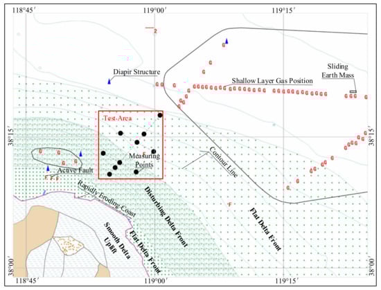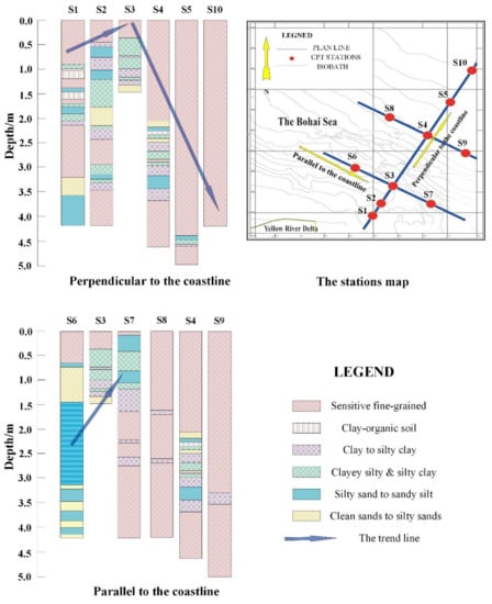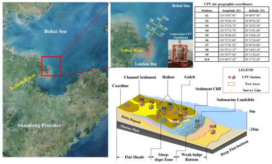 A large number of cables and pipelines are distributed on the bottom of the Yellow River Delta, which is an important area for offshore oil and gas production [1]. Many international researchers have paid full attention to the investigations of the geological disasters in the Yellow River Delta [2,3,4,5], finding that the study area is characterized by complex topography and geological disasters. The shoreline boundary on either side of the estuary moves towards the sea at the average speed of 100 m/month [6]. The engineering characteristics of the sensitive fine-grained soil are relatively complicated, and may produce fluid mud to cause potential marine geological disasters [7,8]. The wave actions will directly lead to changes in the seabed topography at the mouth of the Yellow River, making the construction of the area, the engineering survey of the soil, and the prediction of geological disasters on the seabed difficult [9,10]. The Yellow River Delta is located at the intersection of the Yellow River and Bohai, which will cause sediment accumulation, and the effect of waves will cause the erosion of silt and sediment [11]. Changes in the erosion and deposition of the Yellow River Delta will seriously affect the development of ports [12]. Besides this, the deposition of the seabed results in frequent instability accidents, making it challenging to develop offshore projects on a large scale [13]. Therefore, the geological conditions in the Yellow River Delta are relatively complex, with an uneven distribution of soil layers, diverse soil composition, the influence of ocean tide dynamics, river erosion and accumulation on the coast, etc. Various conditions make the assessment of the strata of the Yellow River Delta region and exploration work very complicated. As a result, it is very important to investigate the variability of the entire test area. The variability is composed of the value and change of horizontal and vertical variability.